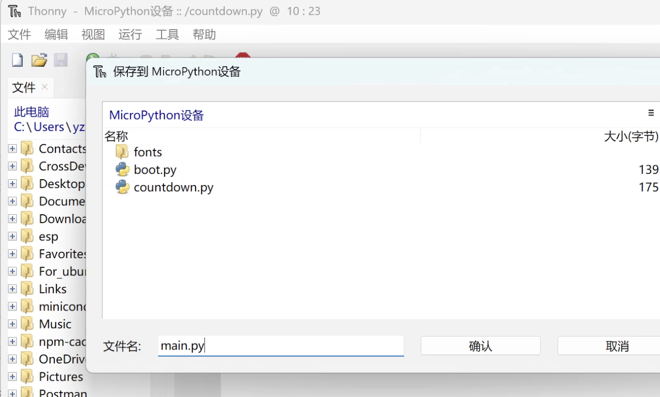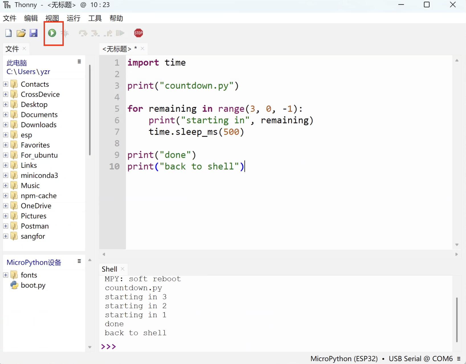 如果你希望上面的倒计时脚本在重新上电后自动执行,可以把它另存为 main.py。